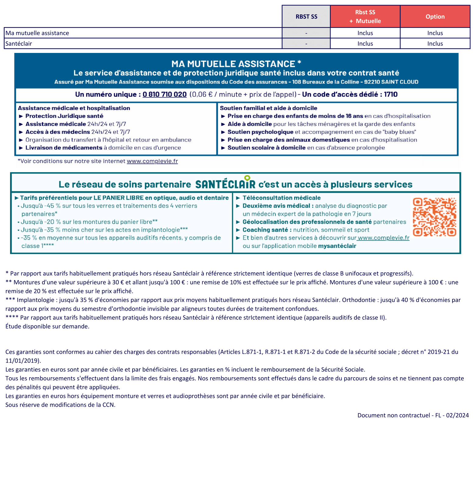 Complévie permet d’accéder au réseau Santéclair (tarifs négociés, téléconsultation 7j/7, deuxième avis médical), propose une application mobile de gestion des remboursements et offre des services d’assistance (aide à domicile, garde d’enfants, etc.).